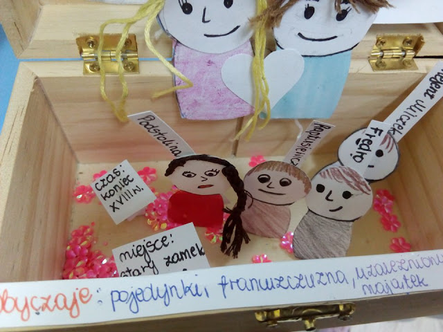 Jedna z uczennic wykonała pudełko. Wykorzystywałam już tę metodę przy okazji pracy z lekturą "Bracia Lwie Serce" w klasach piątych. Wtedy jednak mieliśmy do dyspozycji dość spore pudełko po ptasim mleczku. W tym przypadku zdolna gimnazjalistka zamknęła "Zemstę" w bardzo miniaturowym pudełeczku - i udało jej się to znakomicie! Wszystkie potrzebne elementy zostały w nim umieszczone, a ich skala była dodatkowym utrudnieniem, z którym zmierzyła się uczennica :)